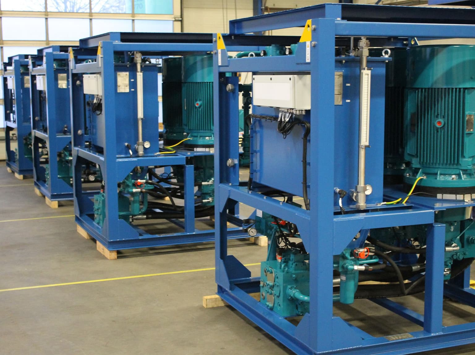Die beiden Pumpensätze bestehen jeweils aus einem 99-kW-Elektromotor mit dahinter liegenden variablen Linde HPV-02 135cc-Pumpen im geschlossenen Kreislauf. Beide sind an einen zentralen Steuerblöcke angeschlossen, so dass die Pumpensätze unabhängig voneinander im geschlossenen System geschaltet werden können. Dies schafft die gewünschte Redundanz auf der Kraftwerksseite. Zur Kühlung wurde ein Wasser/Öl-Plattenwärmetauscher installiert. Alle Aggregate wurden unter DNV-Klassifizierung gebaut, getestet und geliefert.