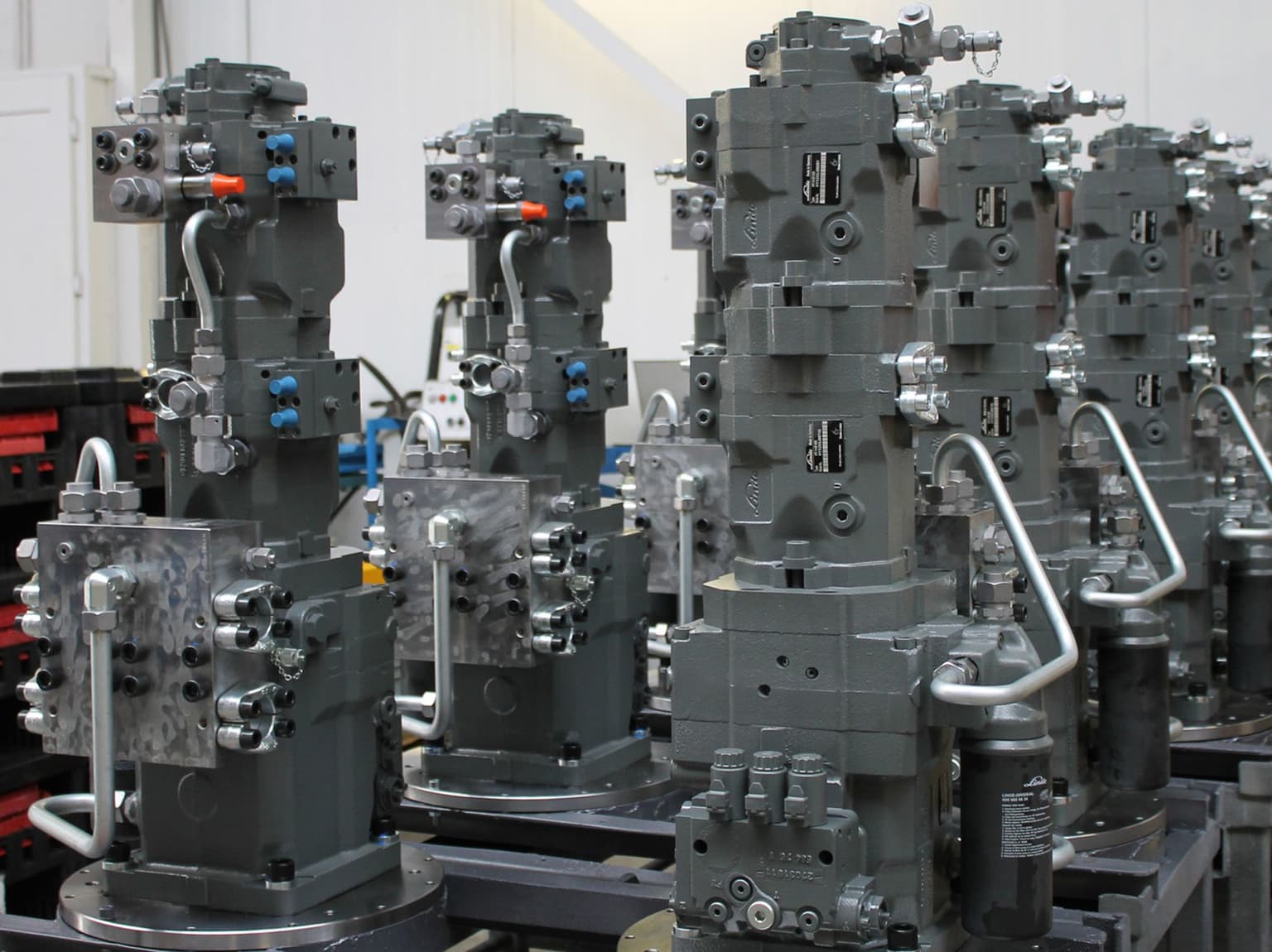 This unique pump set consists of a Linde HPV closed system pump to drive four Linde HMV wheel motors mounted directly on the wheel end reducers. Behind the first pump are two more Linde HPR open circuit pumps. These provide hydraulic wheel steering, spray pump drive and control of all cylinder functions on the boom, among other things.