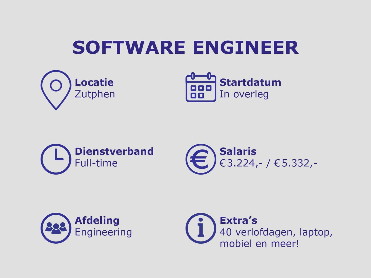Je komt te werken in een inspirerende en gemotiveerde organisatie met een hoog ambitieniveau. Je krijgt van ons een aantrekkelijk verloningspakket (volgens de CAO Metalelektro). Jouw maandsalaris zal ergens liggen tussen € 3.224,- en € 5.332,- op basis van ervaring. Daarnaast zijn er flexibele werktijden, veel vrijheid en meer. Wij geloven in de creativiteit van onze medewerkers!